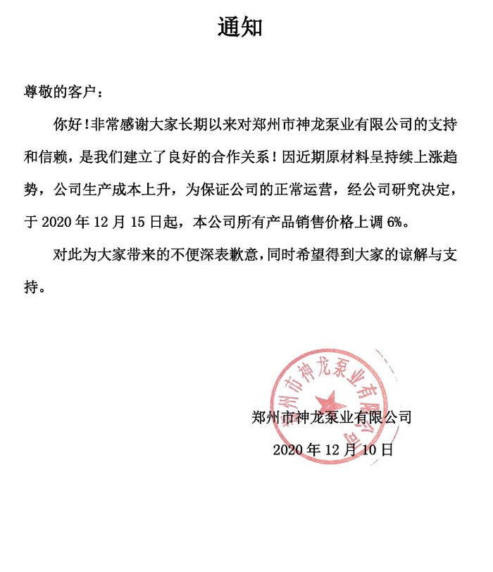 本公司所有產(chǎn)品于2020年12月15日起銷售價(jià)格上調(diào)6%
