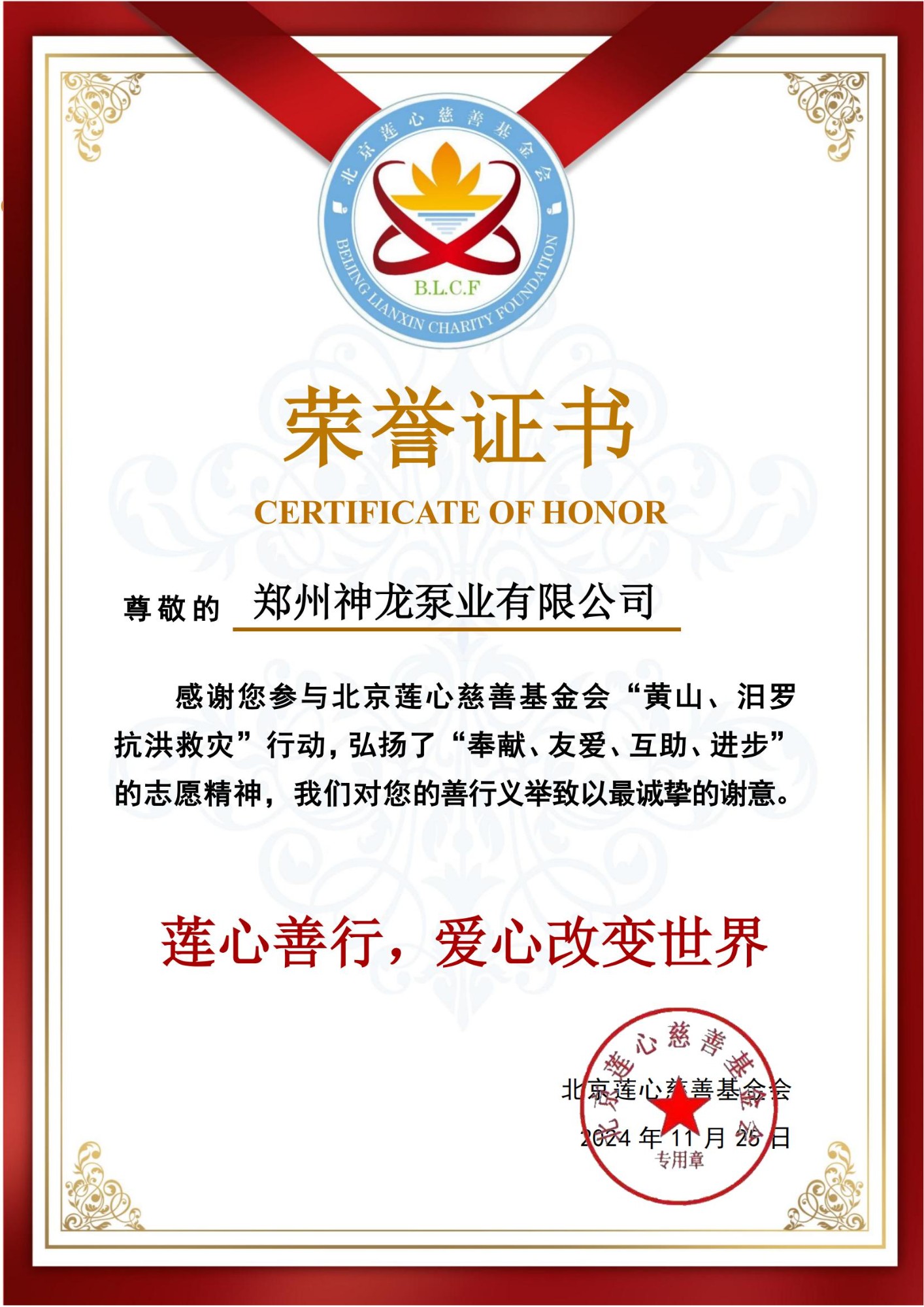 北京蓮心慈善基金會感謝鄭州市神龍泵業(yè)有限公司參與“黃山、汨羅抗洪救災(zāi)”行動